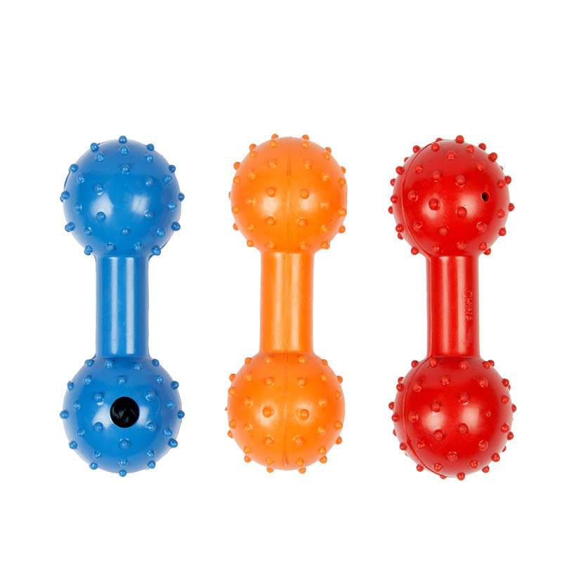 This rubber dog toy from duvoplus in the shape of a dumbbell is ideal for fetching games. The irregular jumpers make for endless playing fun.