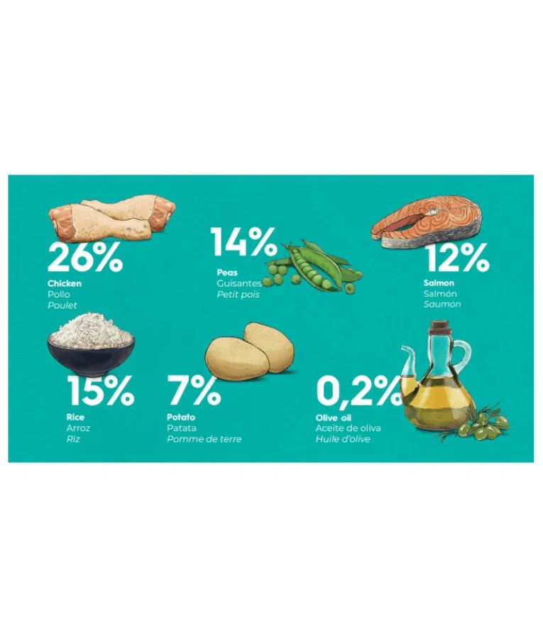 - 52% total chicken and salmon content: With 26% dehydrated chicken and 12% dehydrated salmon for digestible, high-quality protein.