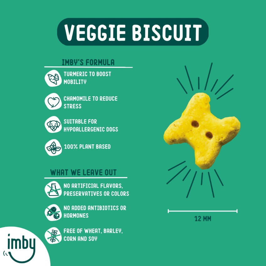 IMBY Snooze & Sleep are 100% plant-based, hypoallergenic calming dog biscuits made with chamomile and curcuma (turmeric) to soothe anxiety and support joint health — all with low calories.