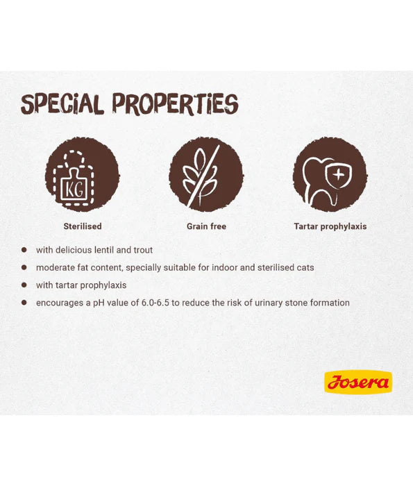 This grain-free recipe features delicious lentil and trout for a tasty meal that's also great for sensitive cats. With a moderate fat content, it's specially designed for indoor and sterilized cats, promoting a healthy weight and reducing the risk of urinary stones.