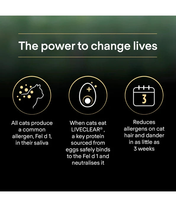 LiveClear is the world’s first cat food proven to safely and naturally reduce allergens. Developed by Purina scientists after 10 years of research, it offers a breakthrough solution for cat owners sensitive to allergens without compromising taste or health.
