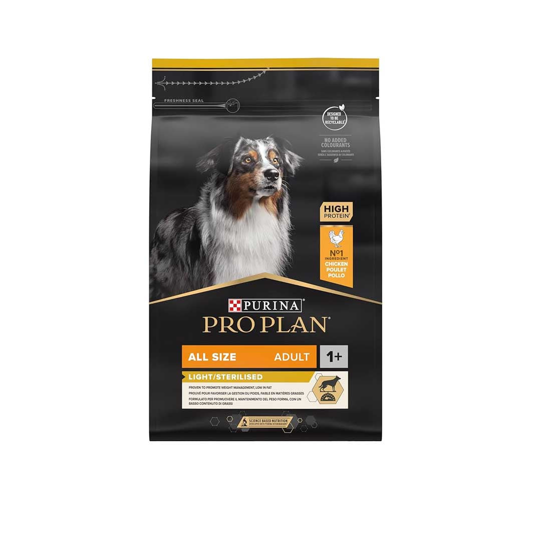Purina PRO PLAN Light / Sterilised ALL SIZE ADULT has been developed for adult dogs of all breeds. This dry dog food contains vitamin D, minerals and specific levels of omega-3 (0.3%) to help support healthy teeth and gums. It is rich in high quality chicken and provides optimal nutrition for your dog's adventures from 12 months of age.