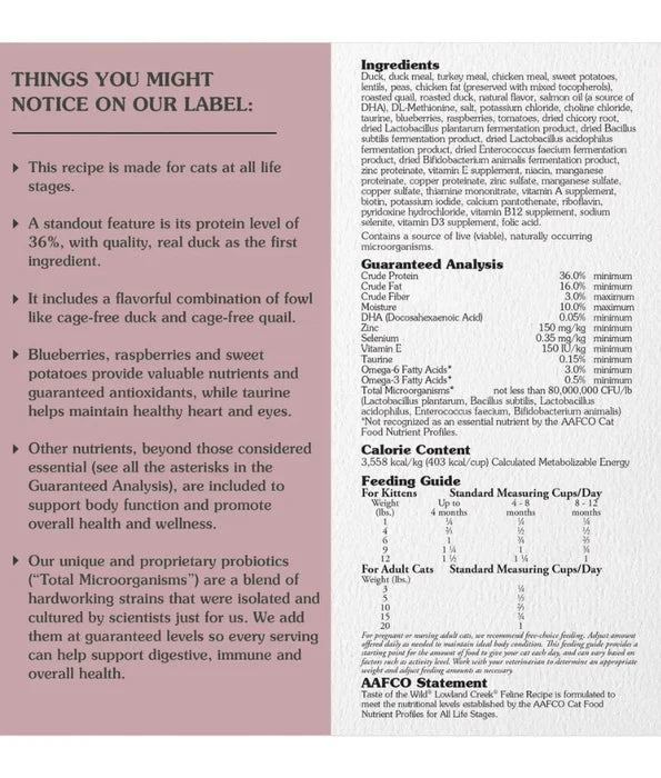 Cage-free quail and cage-free duck are both highly digestible proteins, making this recipe a great diet for the feline that craves fowl. A cat food for all life stages, Lowland Creek features species-specific probiotics for digestive and immune support, taurine to support a healthy heart and eyes, and antioxidants from vegetables, legumes and fruits for overall well-being.